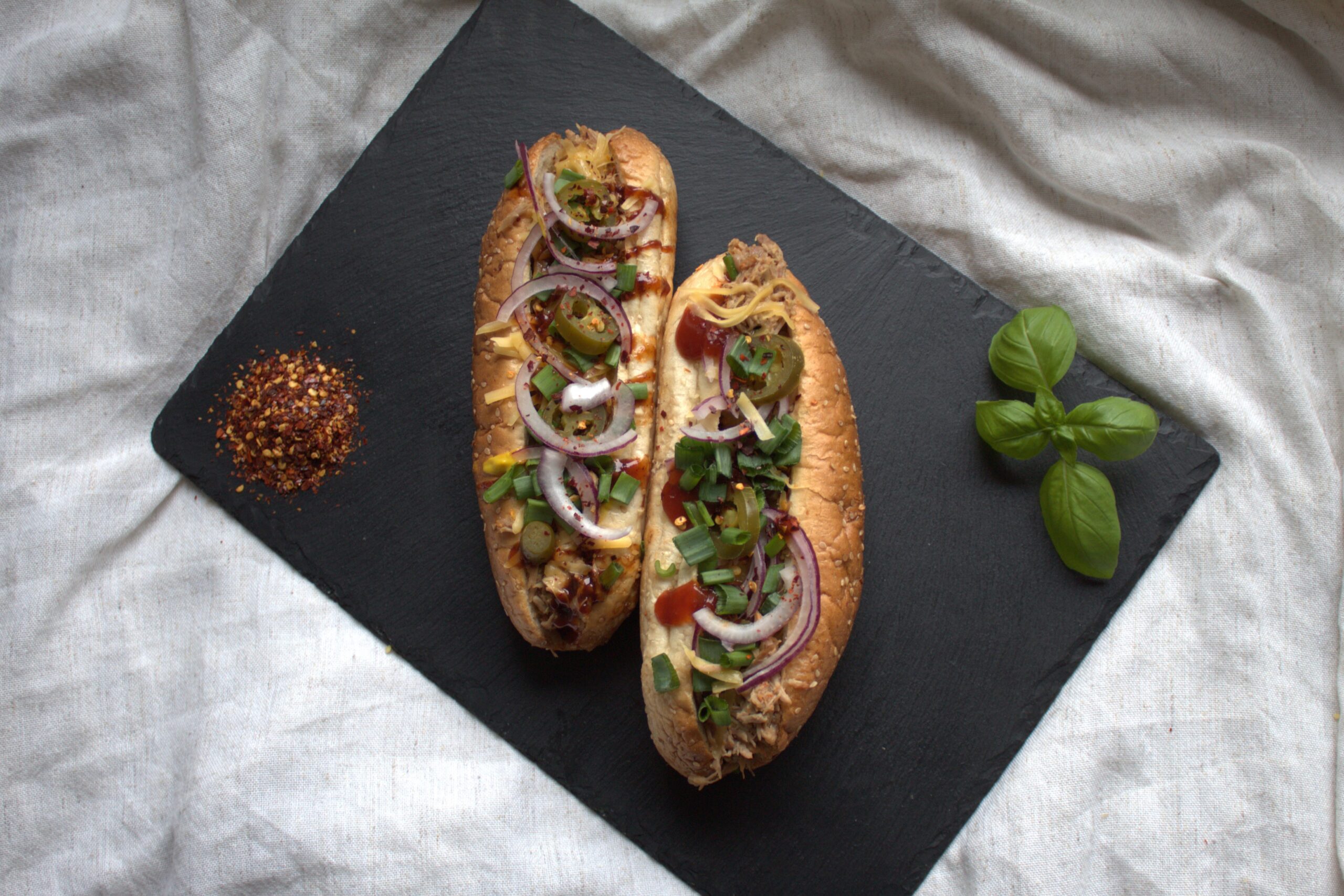 Serwujemy kanapki z szarpaną wieprzowiną.